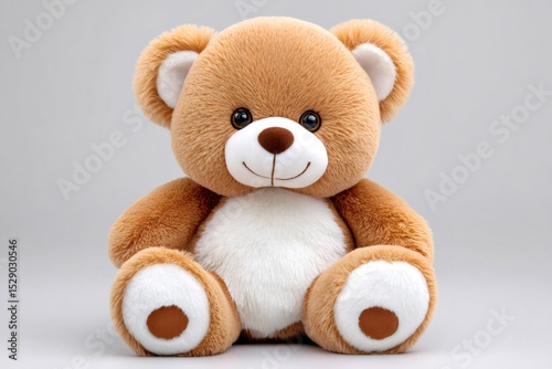 © Gatherina, Obraz premium Smiling teddy bear sitting on gray background