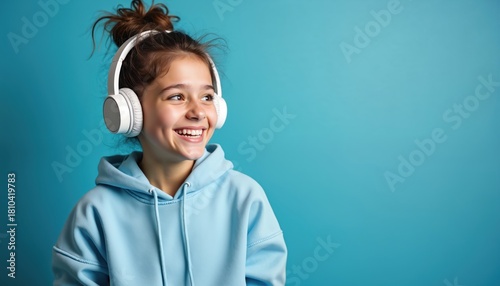 © Maryna, Fototapeta premium Smiling teen girl wears headphones. Young female with earphones listens music on blue background. Happy woman in hoodie enjoys audio. Joyful student listens playlist or song.