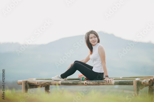 © j_chaikom, Fototapeta premium Smiling teenage girl sitting on bamboo bench.