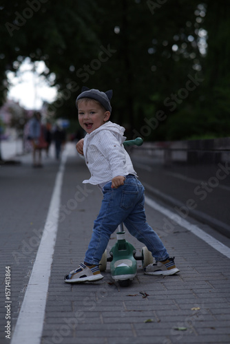 © Евгений Бордовский, Obraz premium Smiling toddler boy standing outdoors with a green scooter on a paved street, wearing a striped hoodie, jeans, and a cute hat with ears. Urban background with soft natural lighting.