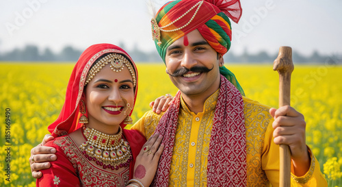 © Shivani, Naklejka premium Smiling traditional Indian couple in vibrant wedding attire standing in a blooming mustard field