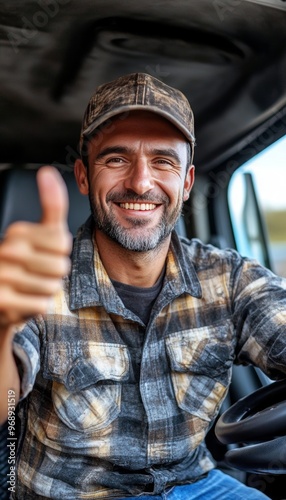 Fototapeta premium Smiling Truck Driver Giving Thumbs Up While Driving, Transportation and...
