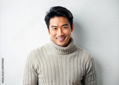 Obraz premium Smiling Vietnamese male model in his 30s dons a warm sweater against a clean...