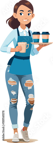 Obraz premium Smiling waitress carrying hot drinks on tray and mug in hand