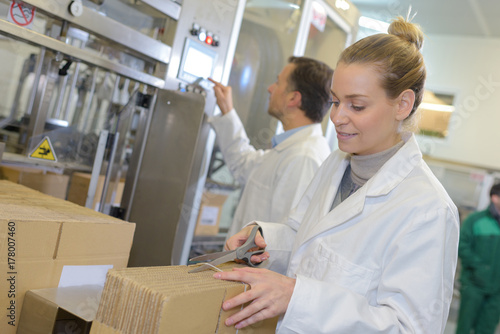 © auremar, Obraz premium smiling warehouse manager opening cardboard box in a large warehouse