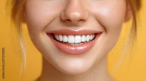 Obraz premium Smiling Woman Close-Up Portrait with Bright White Teeth Against a Yellow...