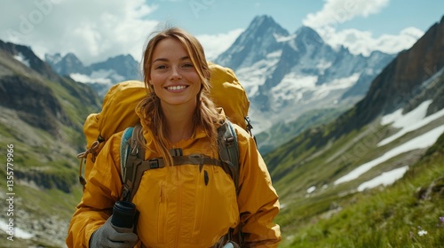 © Basileus, Naklejka premium Smiling woman hiker stands against a stunning mountain backdrop
