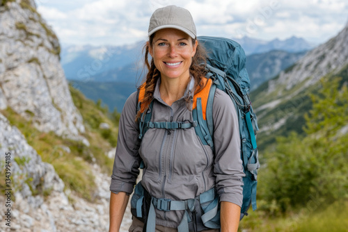 Naklejka premium Smiling woman hiking in mountains with backpack