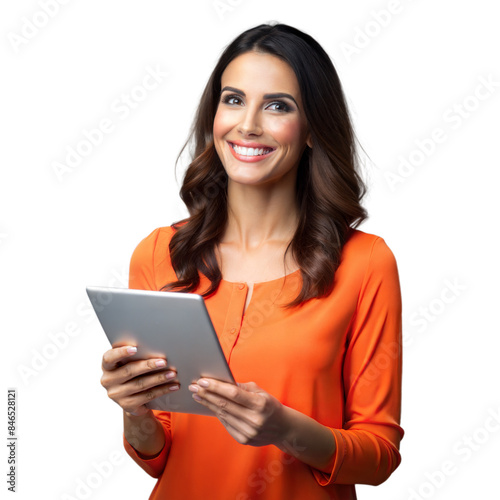 Fototapeta premium Smiling woman holding digital tablet on transparent background
