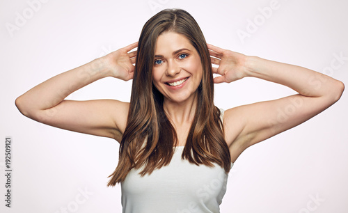 © Yuriy Shevtsov, Fototapeta premium Smiling woman holding hand up.