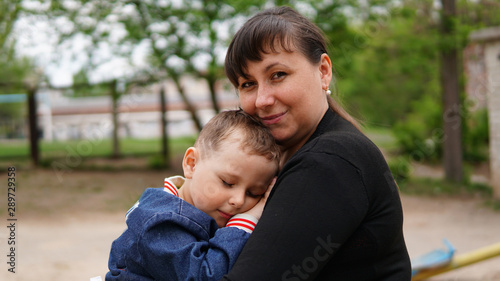 © www.akolosov.art , Fototapeta premium Smiling woman hug cute little boy on playground. Boy close eyes