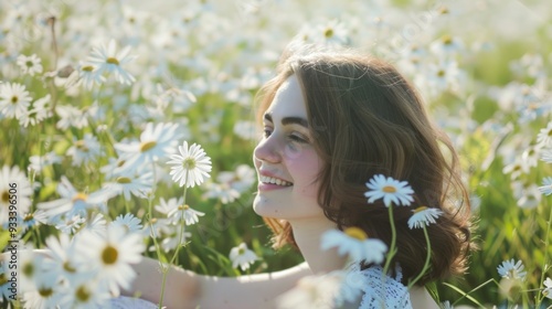Fototapeta premium Smiling Woman in a Field of Daisies