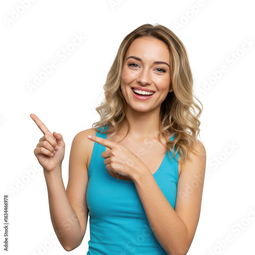© Nahid, Fototapeta premium Smiling woman in blue tank top pointing isolated on transparent background