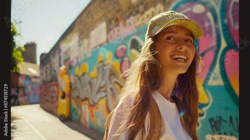 Fototapeta premium Smiling woman in casual outfit standing beside vibrant graffiti wall on sunny...