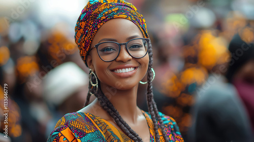 Fototapeta premium Smiling woman in colorful African cultural clothing. Large crowd of people around. Big march for Black Awareness Day. Woman central figure in diverse group. Event active, cheerful. Cultural