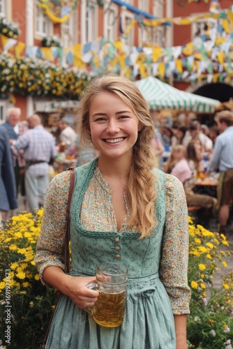 Obraz premium Smiling woman in dirndl holding beer at festive outdoor celebration event....