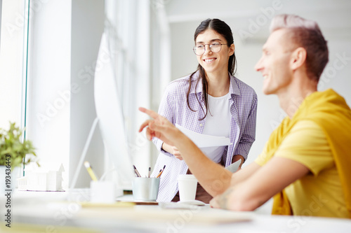 Fototapeta premium Smiling woman in eyeglasses looking at monitor display while her colleague or groupmate explaining online data