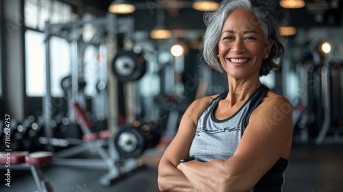 Fototapeta premium Smiling woman in gym wearing tank top standing confidently with arms crossed surrounded by exercise equipment.