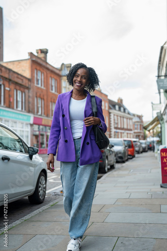 Fototapeta premium Smiling woman in purple jacket walking in city