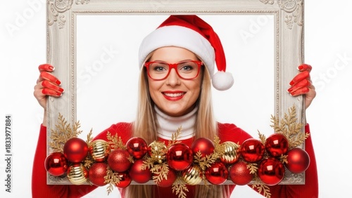Naklejka premium Smiling woman in Santa hat and red glasses peeks through an ornate Christmas frame