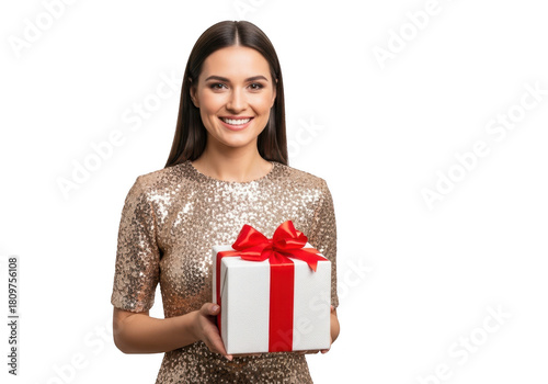 © AMS Studio, Fototapeta premium Smiling woman in sequined dress holding a gift, isolated on transparent background