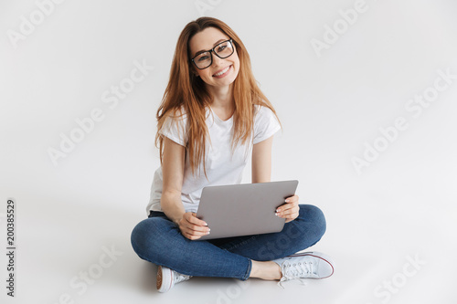 © Drobot Dean, Fototapeta premium Smiling woman in t-shirt and eyeglasses sitting on the floor