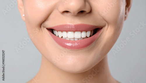 © Tomsdoingstuff, Fototapeta premium Smiling woman on light grey background, closeup, showcasing dental veneers for a bright and confident smile