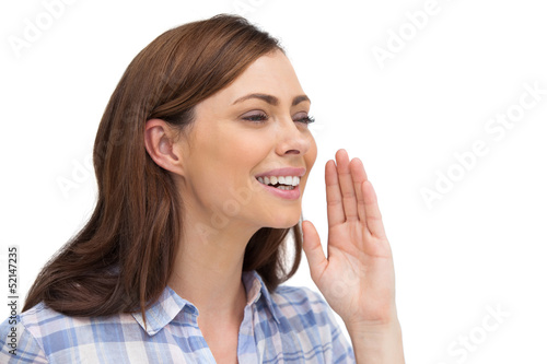 Fototapeta premium Smiling woman placing her hand to say something