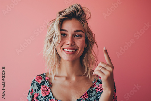 © agnes, Fototapeta premium Smiling woman pointing up on pink background