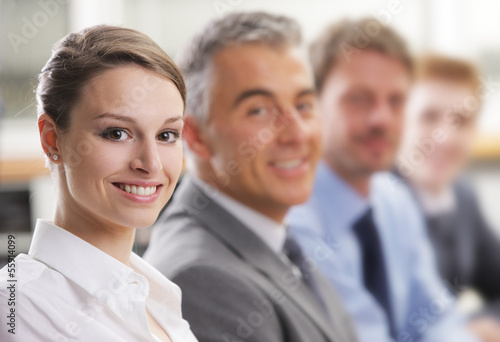 Fototapeta premium Smiling woman sitting at a business meeting with colleagues