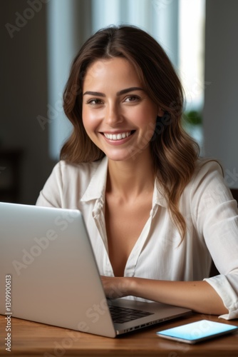© haiqiang, Naklejka premium smiling woman sitting at a table with a laptop computer