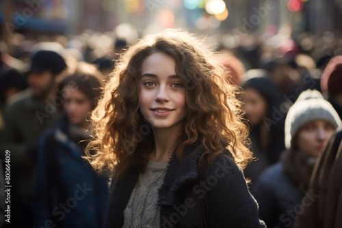 Fototapeta premium Smiling woman with curly hair in a crowd