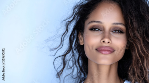 © Chari, Obraz premium Smiling woman with curly hair poses confidently against a light backdrop