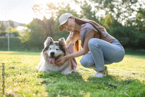 Obraz premium Smiling woman with her cute Alaskan malamute dog on green grass outdoors in morning