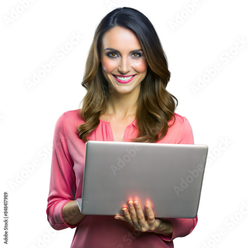 © DesignVectX, Naklejka premium Smiling woman with laptop on transparent background