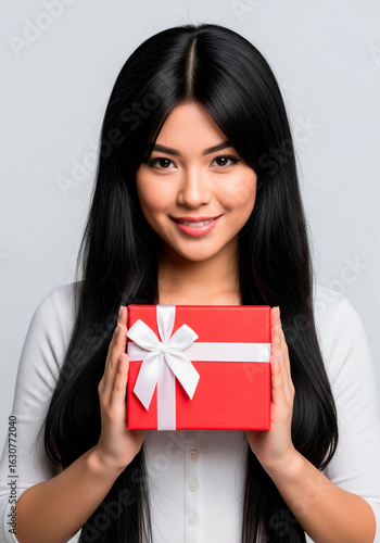 Fototapeta premium Smiling Woman with Long Black Hair Holding Red Gift Box with White Bow,...