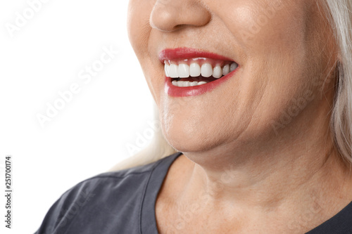 Obraz premium Smiling woman with perfect teeth on white background, closeup