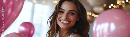 © HQAsset, Fototapeta premium Smiling Woman with Pink Balloons; Festive Portrait Photography Background, Joyful Celebration Atmosphere, Brightly Lit Scene