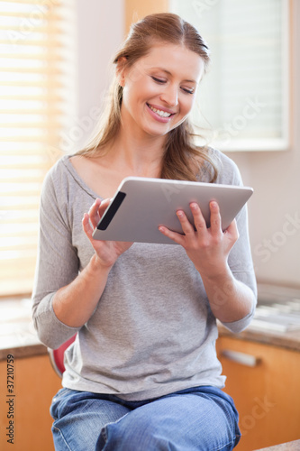 Fototapeta premium Smiling woman with tablet in the kitchen