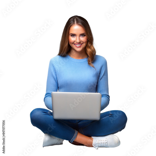 © DesignVectX, Naklejka premium Smiling woman working on laptop in casual attire on transparent background
