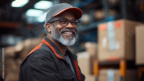 Fototapeta premium Smiling worker in warehouse packing cardboard boxes