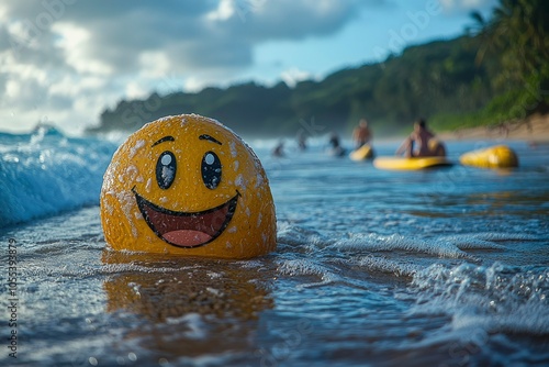 © Outkast, Naklejka premium Smiling Yellow Inflatable Floating in Ocean Waves