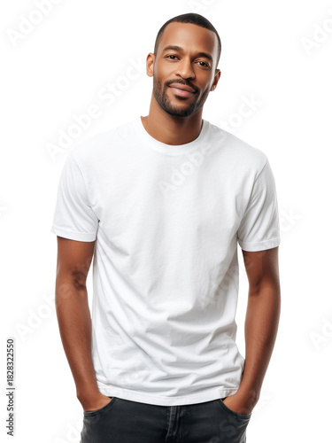 © PixMarket, Fototapeta premium Smiling young African American man wearing casual white t-shirt, isolated on transparent background