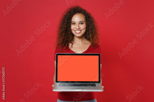 © ViDi Studio, Naklejka premium Smiling young african american woman girl in casual t-shirt posing isolated on red background studio. People lifestyle concept. Mock up copy space. Hold laptop pc computer with blank empty screen.