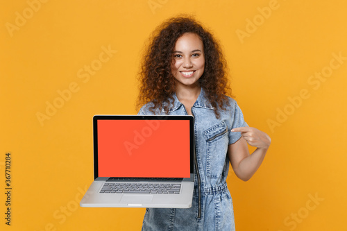 © ViDi Studio, Naklejka premium Smiling young american girl in casual denim clothes isolated on yellow background. People lifestyle concept. Mock up copy space. Pointing index finger on laptop pc computer with blank empty screen.