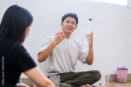 © Queenmoonlite Studio, Fototapeta premium Smiling Young Asian Male Showing Scissors And Plastic Bottle While Sitting On Floor