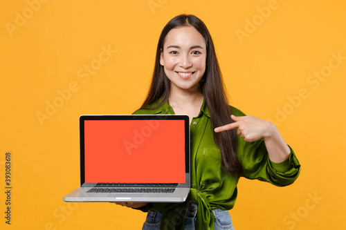 Naklejka premium Smiling young brunette asian woman in basic green shirt standing pointing index finger on laptop pc computer with blank empty screen mock up copy space isolated on yellow background, studio portrait.