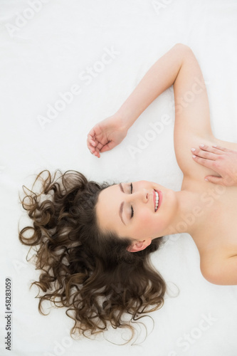 Obraz premium Smiling young brunette sleeping in bed