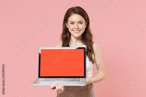 © ViDi Studio, Naklejka premium Smiling young brunette woman girl in light casual clothes posing isolated on pastel pink wall background. People lifestyle concept. Mock up copy space. Hold laptop pc computer with blank empty screen.
