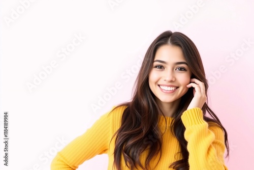 © mamo studios, Fototapeta premium Smiling young brunette woman girl in yellow sweater posing isolated on pastel pink wall background, studio portrait. People sincere emotions lifestyle concept. Mock up copy space. Looking camera